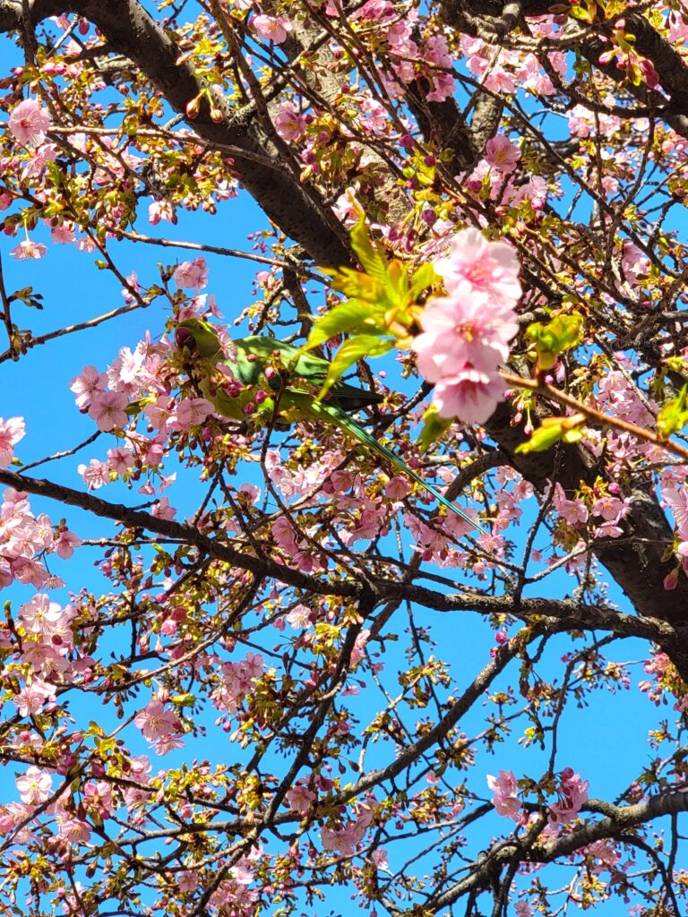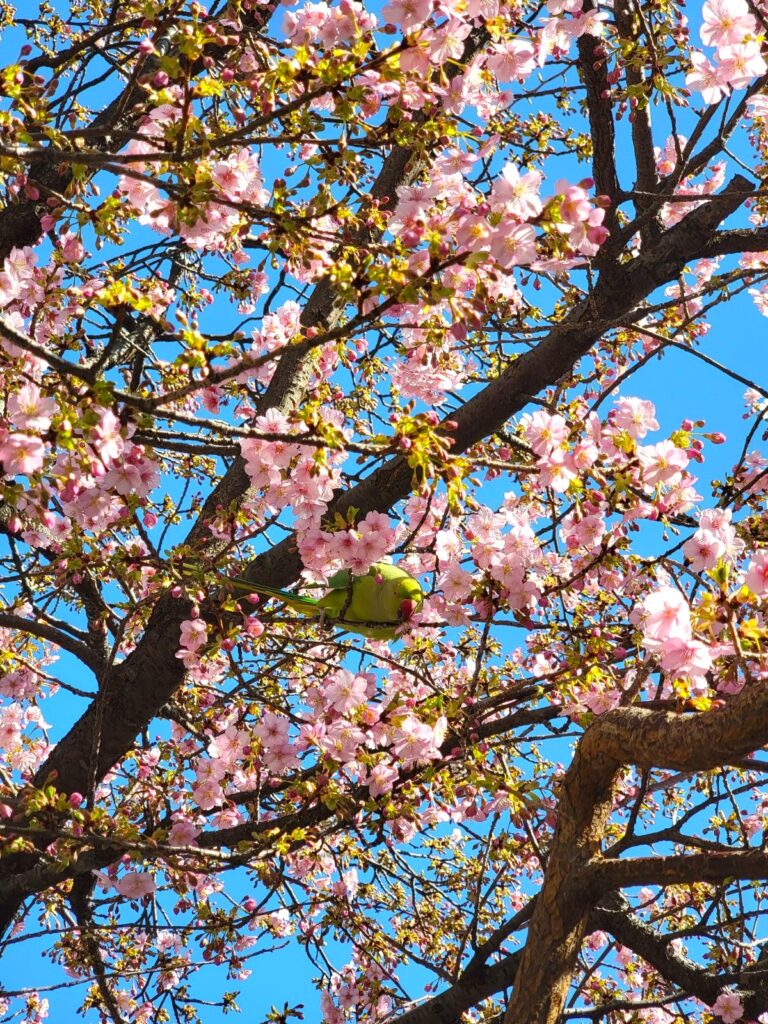 中野区 新江古田の総合東京病院前に綺麗な寒桜が咲いているなと思って見ていたら、南国系の鮮やかな蛍光グリーンに赤いクチバシの派手な大きなインコが!派手なのですが意外とカモフラージュされています。