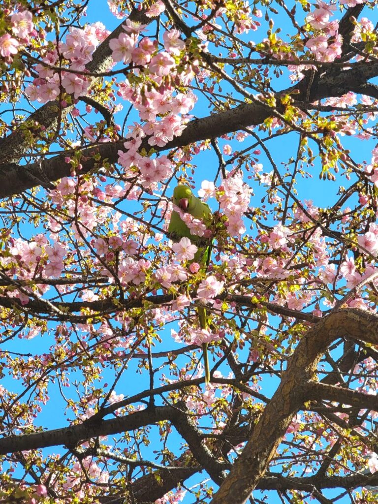意外とカモフラージュされて寒桜と一体化している野生化したワカケホンセイインコ